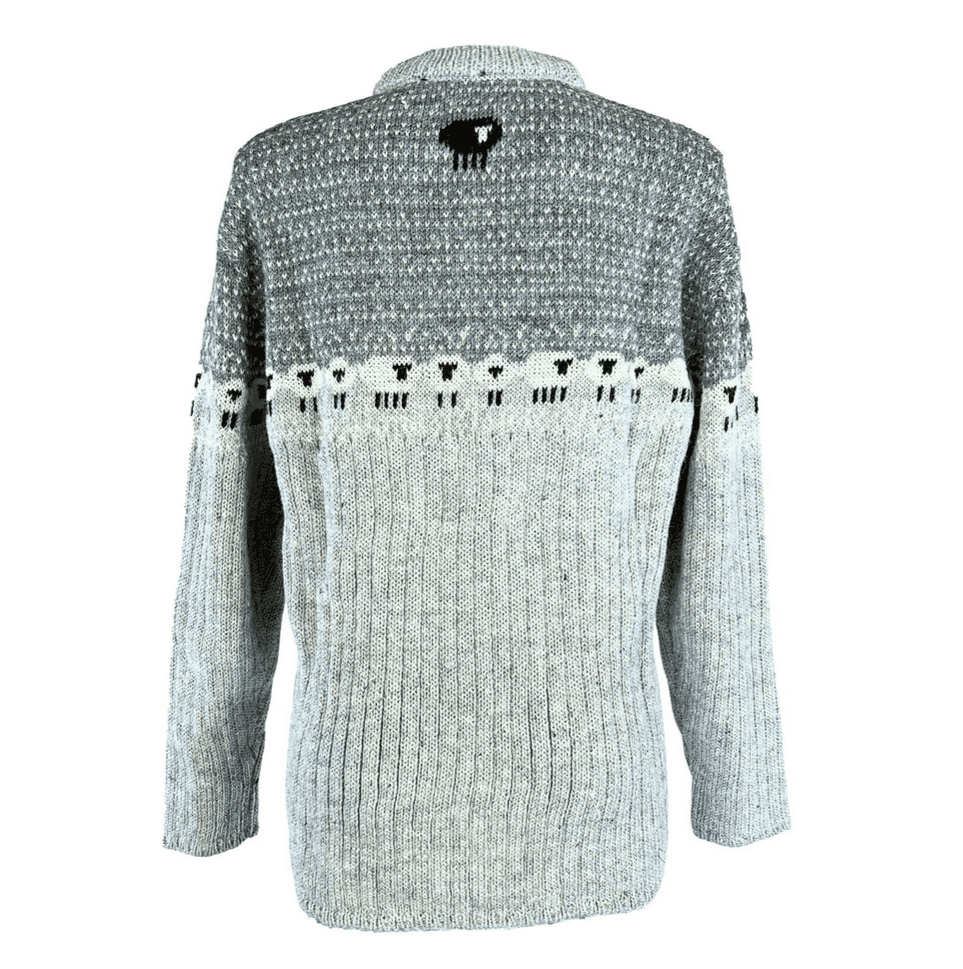 Made from a medium weight wool, which is finer than our chunkier knits but not as delicate as merino, it's patterned all the way around the chest, back and arms with sheep but there's a black sheep on the chest, and also one on the back of the neck! The jumper is in shades of grey, with a ribbed knit to ensure a comfortable fit around the chest and arms. The collar is a crew neck. Sizes Small to XXL, these sweaters are now in stock. To help you find the right size, there's a guide in the product listing here.
